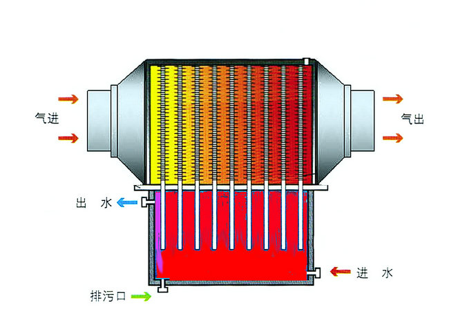热管余热回收装置体积小,只是普通热交换器的1/3。其工作原理如下图所示:左边为烟气通道,右边为清洁空气(水或其它介质)通道,中间有隔板分开互不干扰。高温烟气由左边通道排放,排放时高温烟气冲刷热管,当烟气温度>30℃时,热管被激活便自动将热量传导至右边,这时热管左边吸热,高温烟气流经热管后温度下降,热量被热管吸收并传导至右边。常温清洁空气(水或其它介质)在鼓风机作用下,沿右边通道反方向流动冲刷热管,这时热管右边放热,将清洁空气(水或其它介质)加热,空气流经热管后温度升高。