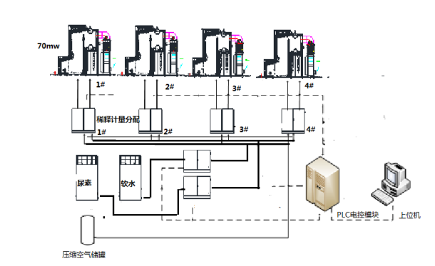 尿素溶液经配制并储存后,由在线稀释系统根据锅炉运行情况和NOx排放浓度情况在线稀释成所需的喷射量,送入喷射系统。喷射系统实现各喷射层的尿素溶液分配、雾化喷射和计量,还原剂的供应量能满足锅炉不同负荷的要求。整套电气控制系统调节方便、灵活、可靠,在设备间、炉房喷点现场及控制室均能联动控制。锅炉脱硝整体工艺流程如下: